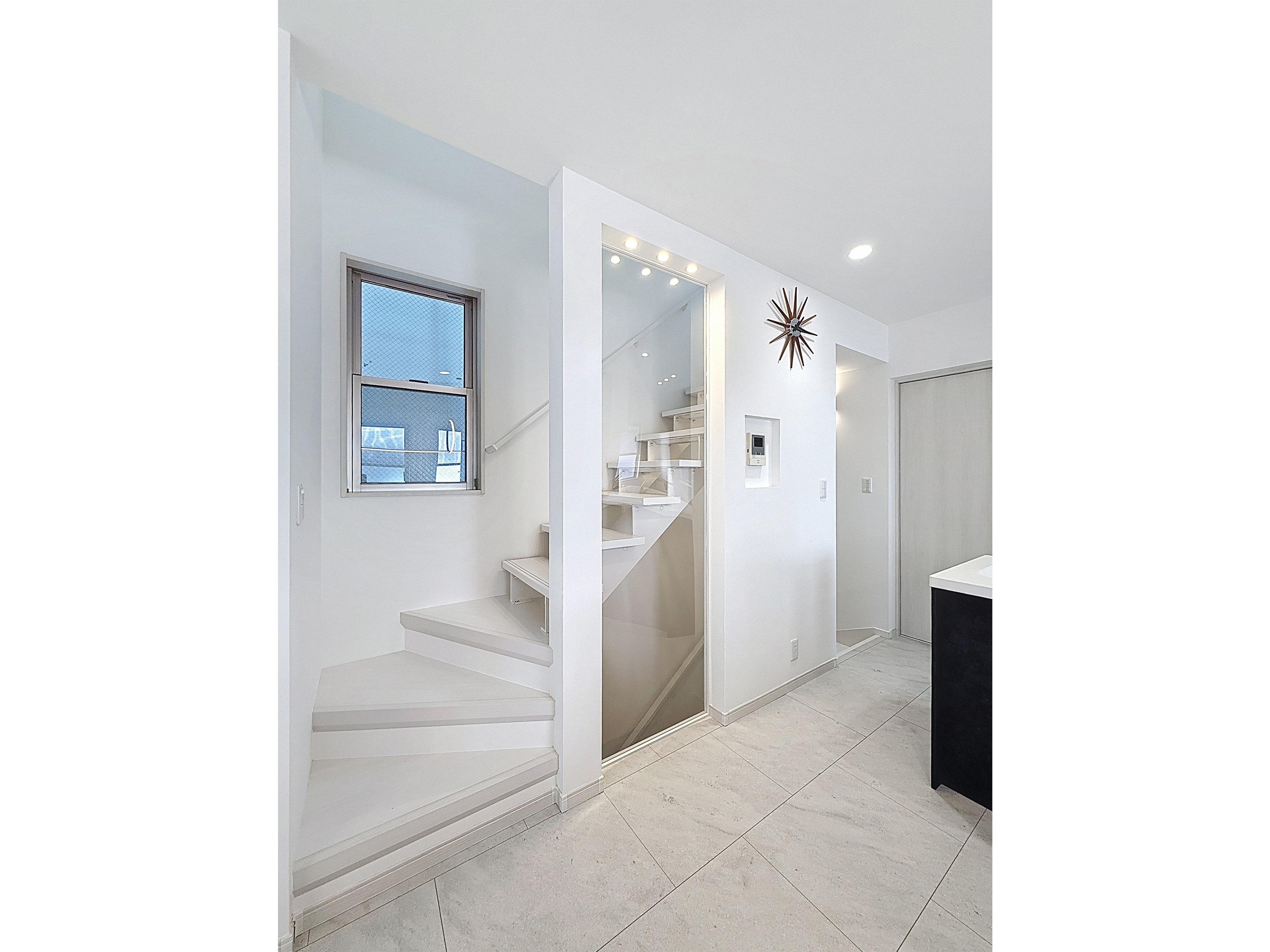 階段に沿った格子窓をアクリル板に変更したことで空間全体がより開放的で洗練された印象になりました。遮るものが減り、照明の光が階段や廊下にも広がり、明るさと抜け感が増して理想のホテルライクな空間が叶いました。