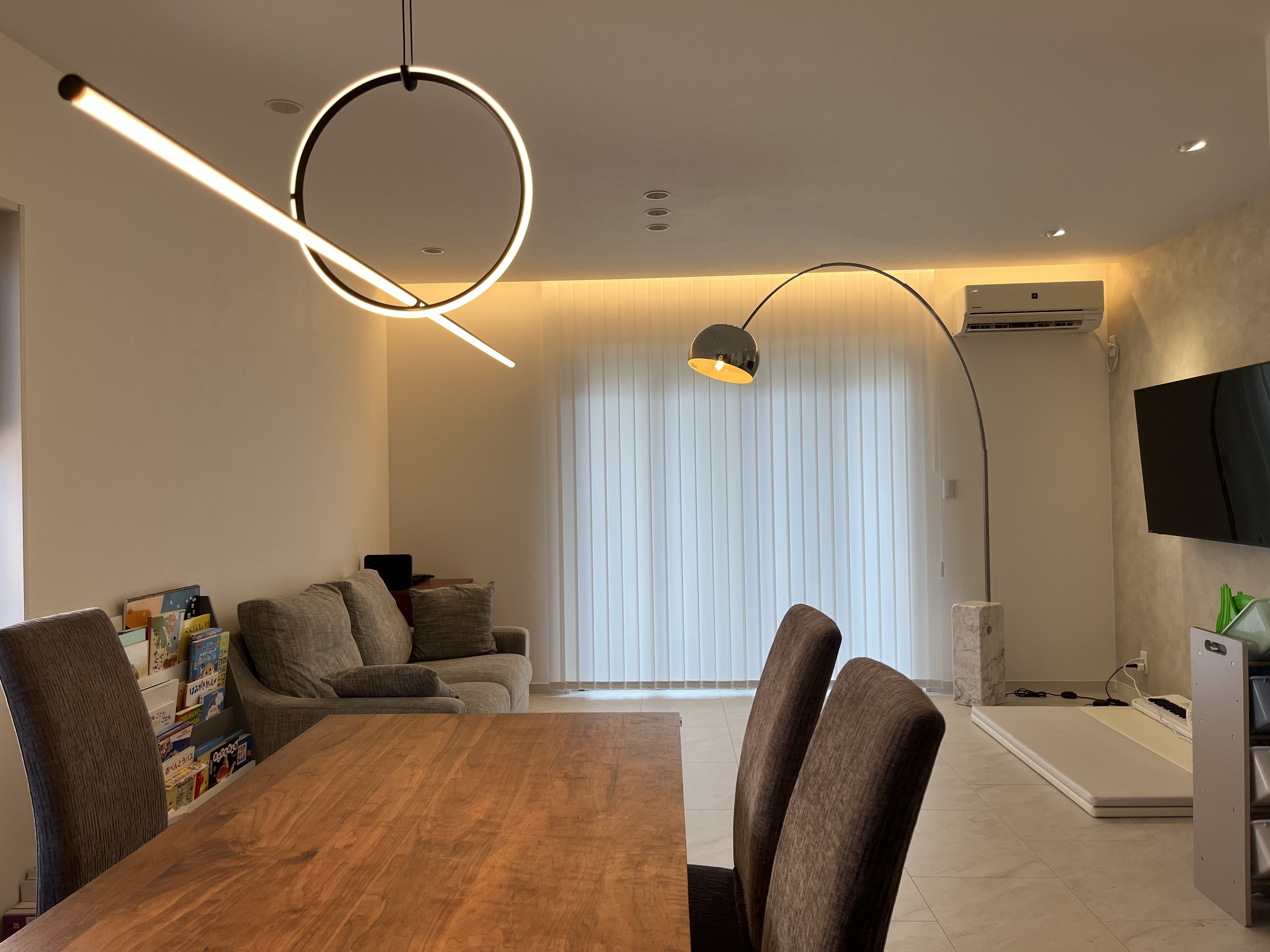 リビングでは、間接照明や照明器具の使い方に工夫し、コストを抑えながらも空間に変化と奥行きを持たせることを意識しました。