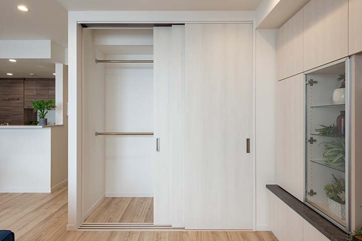 空間の使い勝手がとても良くなりました。最初の頃はなぜ廣瀬さんが色々と細かく質問されるのか戸惑いましたが、住んでみてその意図がわかりました。夫はリビングのクローゼットがお気に入りで、収納量や夫の身長に合わせていただいたハンガーパイプの高さもちょうどいいと話していました。開き戸から引き戸に変えたことも良かったです。