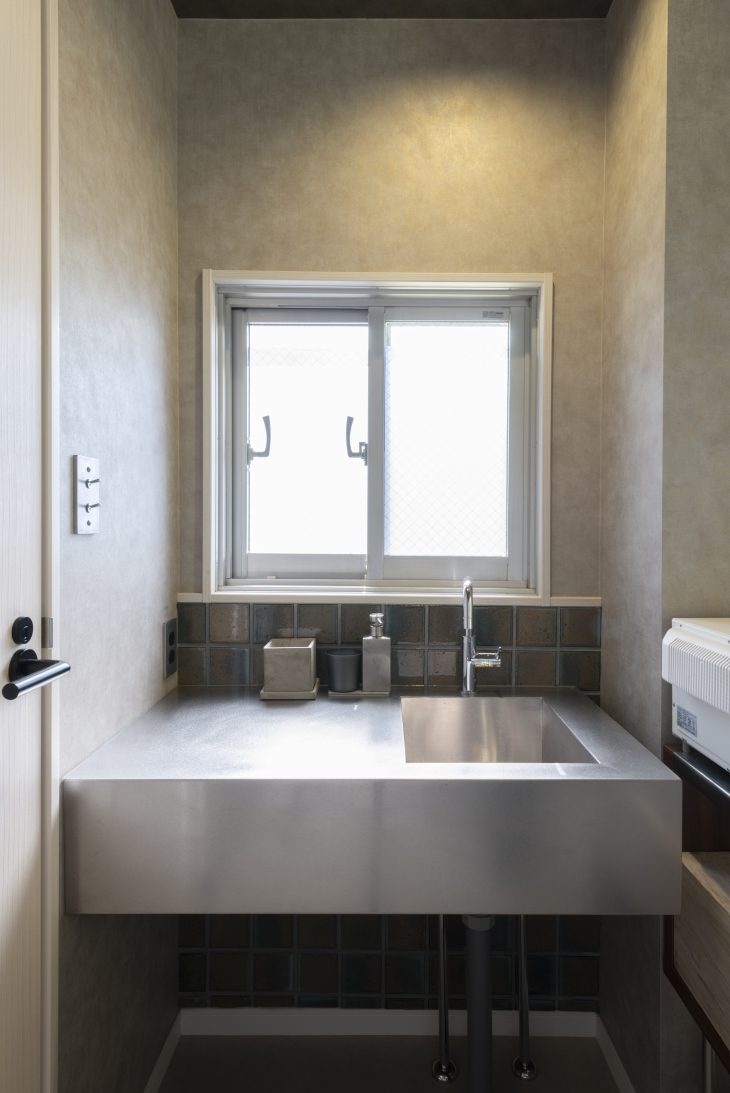 奥様:キッチンタイルや、造作してもらった洗面台、かわいいスイッチも気に入っています。ご主人: 一見無機質な洗面台やダクトがキッチンの雰囲気に合っていて良いですね。私もスイッチが、遊び心が感じられて気に入っています。