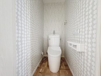 コンパクトなトイレには、北欧柄の優しい色合いのクロスを取り入れてホッとする空間に。