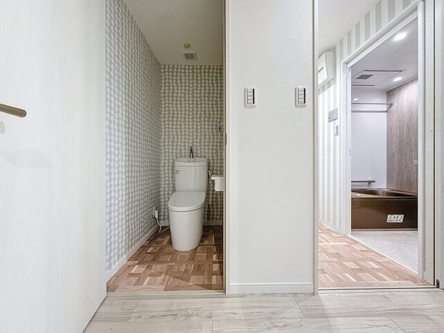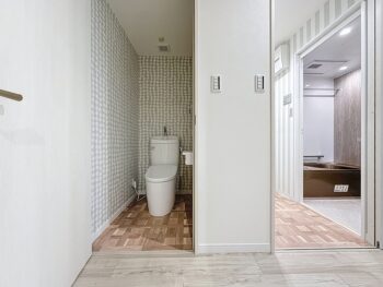 一段低くなっていた廊下の高さを上げて、トイレと洗面空間の出入口をフラットに。将来のバリアフリー対策です。