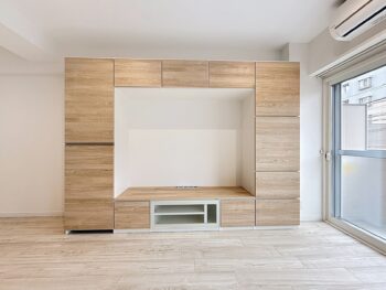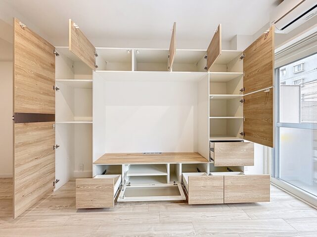 ダイケンのテレビボードを採用し、大容量の収納スペースをつくりました。