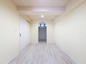 寝室には、調湿性に優れた塗り壁材「キララ」をご提案。リビング側に扉をつくらずアーチ型の出入口をつくり、光と風が通りやすい開放感を演出しました。