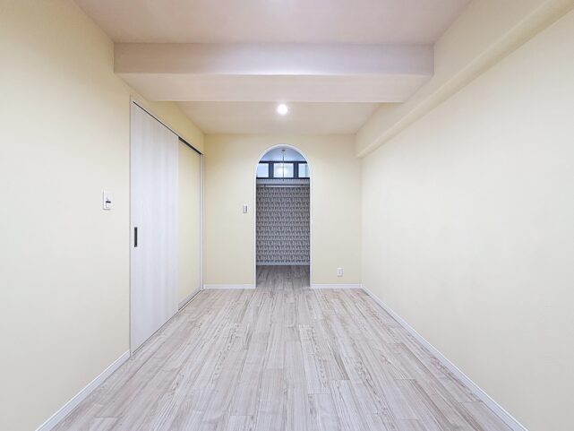 全体を淡い木目調でコーディネート。リビングから寝室への入口をアーチ状にしたことで優しい印象がプラスされました。