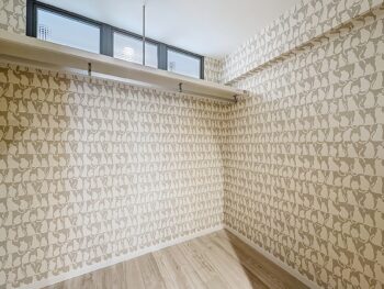 寝室の先にウォークインクローゼットをつくりました。猫ちゃん柄のクロスに和みます。