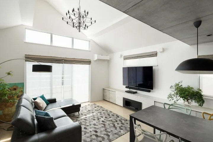 トップライトから光がこぼれ落ちる明るいリビングには、バイオエタノール暖炉を設置。暖炉の周りのサイドボードの高さは低めにし、伸びやかな空間を最大限に活かすように設計しました。ご家族で美しく、暖かな炎を見つめる心穏やかな時間が過ごせます。